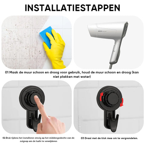 - Boren, spijkeren, lijmen, installeren en gebruiken zonder schade aan de muur is niet nodig.